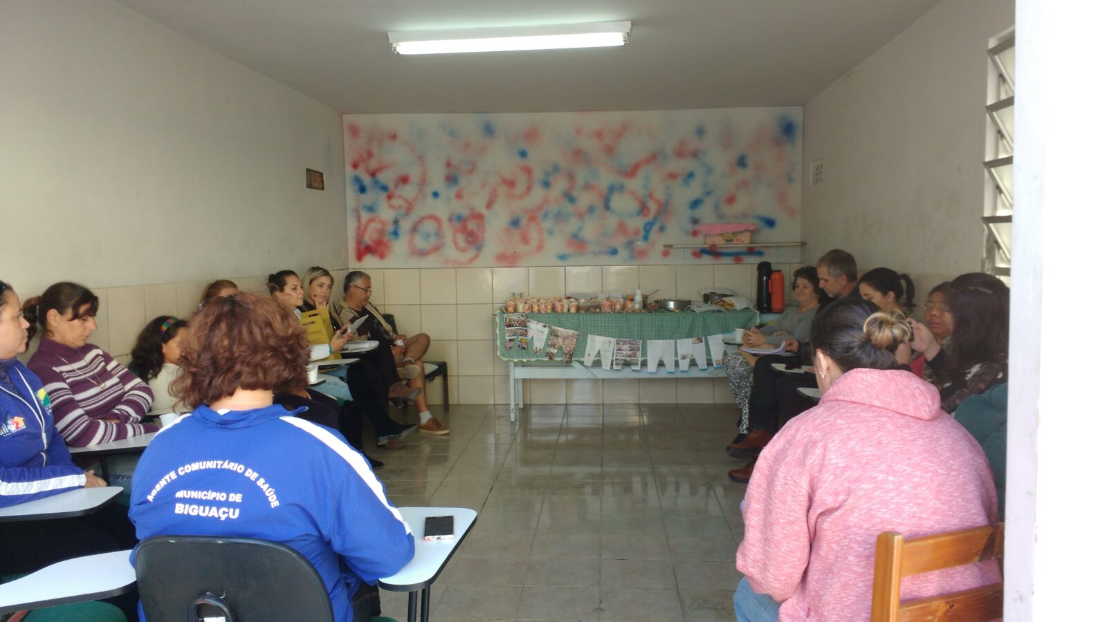 Alunos do curso de Psicologia da Faculdade Cesusc, em conjunto com Agentes Comunitárias de Saúde (ACS), e a orientação da professora Tânia Grigolo, estão realizando um trabalho de Terapia Comunitária, nas Unidades Básicas de Saúde (UBS), em Biguaçu. A atividade consiste em apoiar a equipe de Saúde da Família para atuar em situações que envolvem a atenção psicossocial, nos casos de pacientes em sofrimento psíquico que procuram a UBS.