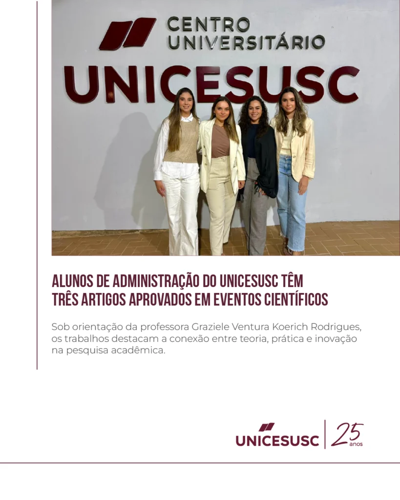 O Centro Universitário Cesusc – UNICESUSC celebra a conquista de alunos do curso de Administração, que tiveram três artigos aprovados em importantes eventos científicos da área, sob orientação da professora doutora Graziele Ventura Koerich Rodrigues. Os trabalhos foram desenvolvidos na disciplina de Marketing e Comportamento e refletem o compromisso da instituição com a formação acadêmica voltada à pesquisa e à inovação.