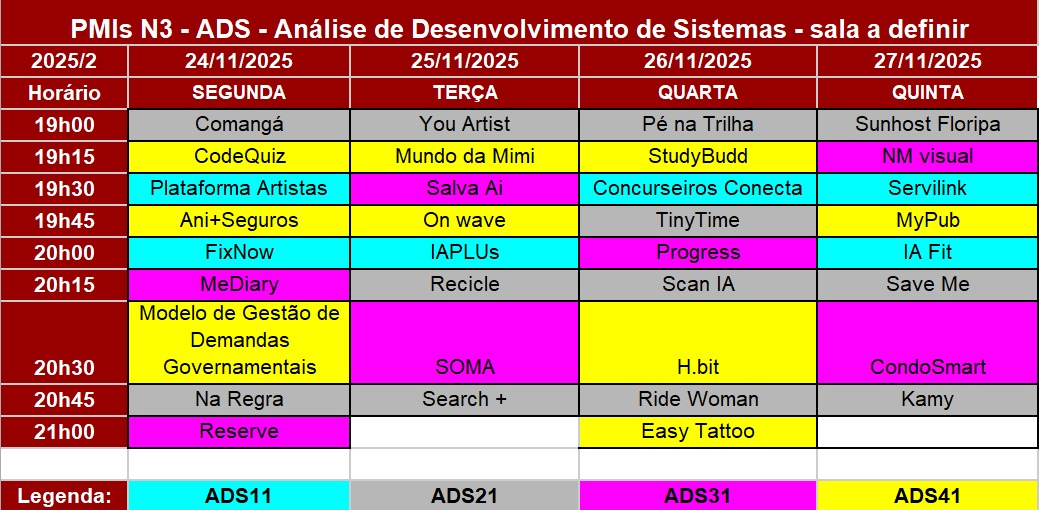 Está disponível o cronograma oficial das bancas dos Projetos Multidisciplinares Integradores (PMI) do curso de Análise e Desenvolvimento de Sistemas do UNICESUSC. As apresentações ocorrem entre os dias 24 e 27 de novembro de 2025, na sala 208, e envolvem os estudantes das turmas ADS11, ADS21, ADS31 e ADS41.