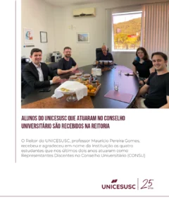 No último dia 11 de novembro, o Reitor do UNICESUSC, professor Maurício Pereira Gomes, recebeu e agradeceu em nome da Instituição os quatro estudantes que nos últimos dois anos atuaram como Representantes Discentes no Conselho Universitário (CONSU).