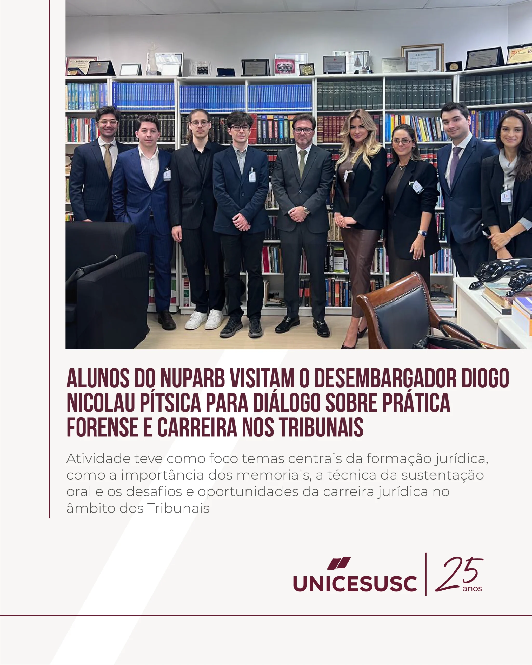 Os alunos do Núcleo de Prática em Arbitragem – NUPARB do UNICESUSC, acompanhados pela Coordenadora do Núcleo, professora Alessandra Carioni, realizaram uma visita institucional ao Desembargador Diogo Pistisca, em um encontro marcado por aprendizado prático, troca de experiências e reflexão sobre a atuação profissional perante os Tribunais.
