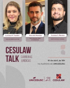 O CESULAW Talk: Carreiras Jurídicas é um evento pensado especialmente para os estudantes do Curso de Direito que desejam entender, na prática, as diversas possibilidades da profissão.