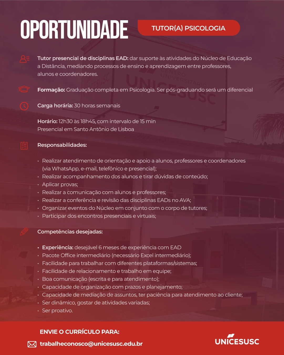 Estamos com vaga aberta para TUTOR(A) DE PSICOLOGIA.