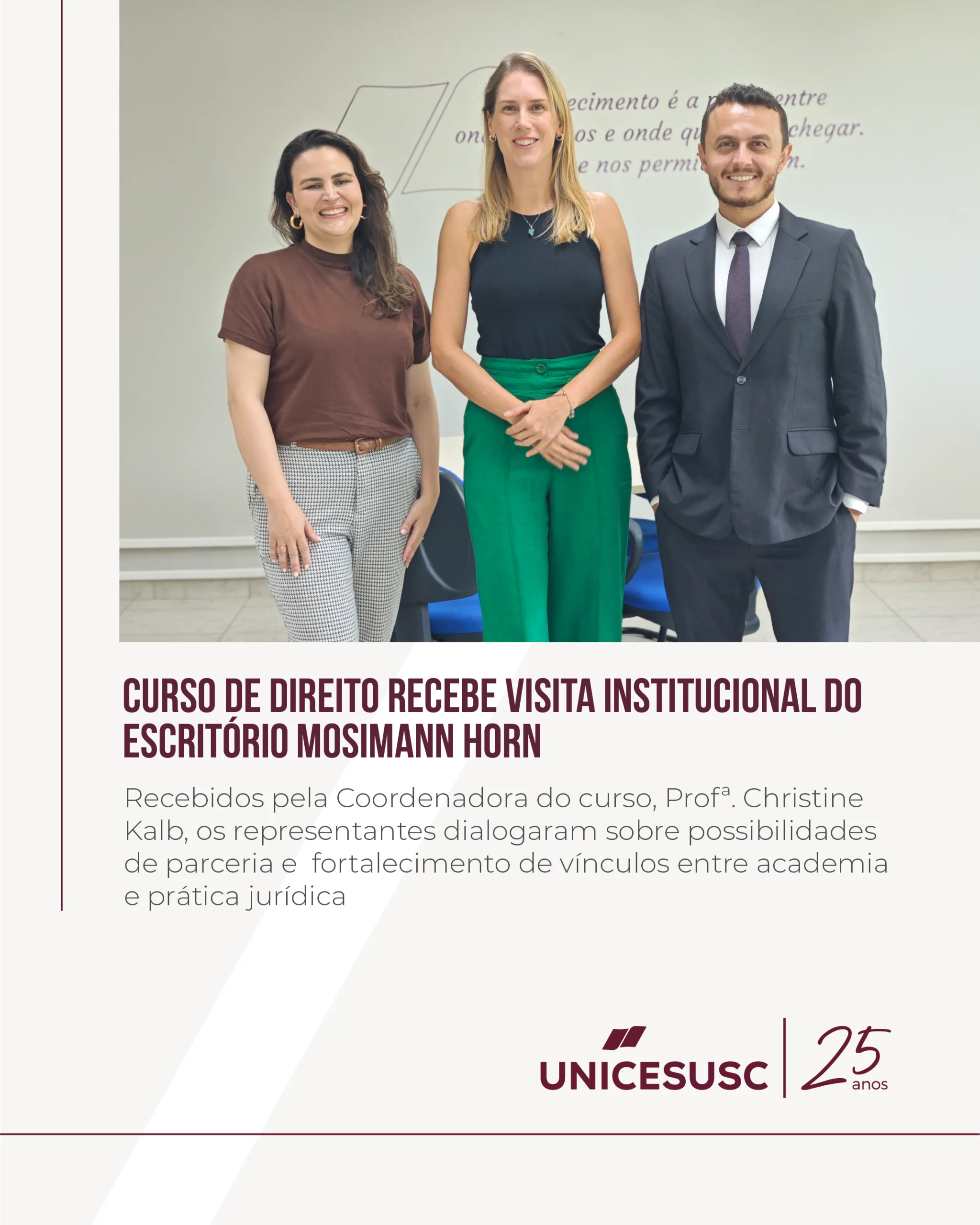 Na última semana, o curso de Direito do UNICESUSC recebeu a visita institucional do escritório Mosimann Horn, em um encontro marcado pelo diálogo e pela troca de experiências.