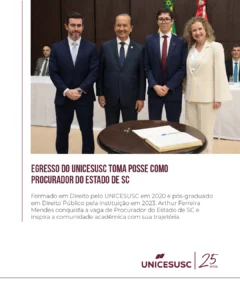 É com grande satisfação que o UNICESUSC compartilha a trajetória de sucesso do egresso Arthur Ferreira Mendes, graduado em Direito em 2020 e pós-graduado em Direito Público em 2023 pela instituição.