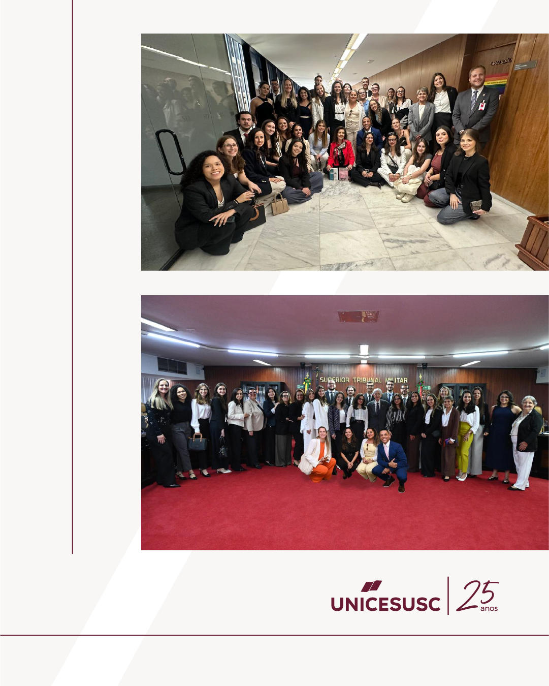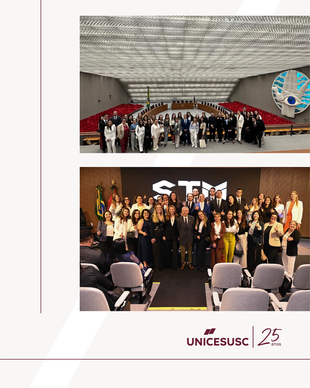 Entre 04 e 07 de novembro, estudantes do curso de Direito do UNICESUSC participaram de uma visita técnica a Brasília, organizada pelos professores Vinícius Corrêa, Christiane Kalb e Gabriela Jacinto. A atividade proporcionou ao grupo contato direto com instituições centrais do sistema de Justiça e da estrutura de governo federal.