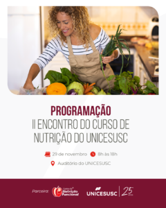O UNICESUSC realiza, no dia 29 de novembro, o II Encontro do Curso de Nutrição, um evento que reunirá profissionais, docentes e estudantes para discutir temas atuais e relevantes da área da saúde e da alimentação.