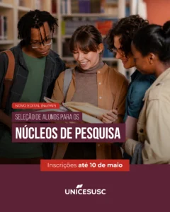 A Pró-Reitoria Acadêmica e o Núcleo de Produção Acadêmica e Publicação (NUPAP) do Centro Universitário UNICESUSC, no uso de suas atribuições, tornam pública a abertura das inscrições para estudantes de graduação interessados(as) em participar dos Núcleos de Pesquisa aprovados no âmbito do Edital Nº 01/2026.