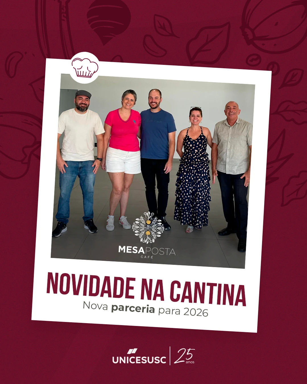 A partir do dia 18 de fevereiro, o UNICESUSC passa a contar com a parceria do Mesa Posta Café, que inicia suas atividades trazendo uma nova experiência de alimentação para a Comunidade Acadêmica.