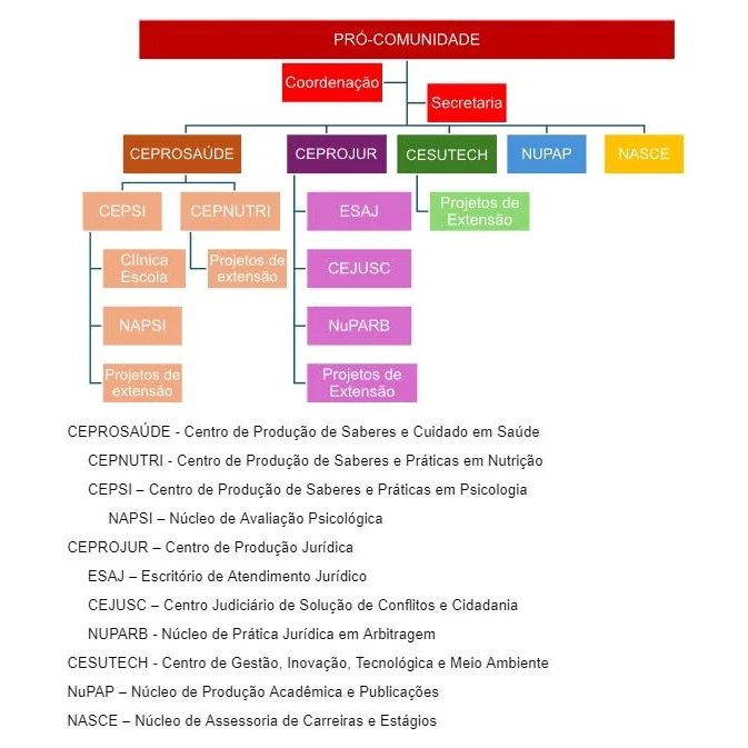 O Pró-Comunidade é um centro que, baseado no princípio da indissociabilidade entre Ensino, Pesquisa e Extensão, tem a função de promover, coordenar e orientar todas as ações de extensão universitária no âmbito do UNICESUSC, promovendo uma interação transformadora entre a Instituição e os diferentes setores da sociedade, estimulando na prática do dia a dia a formação cidadã, crítica e responsável da nossa Comunidade Acadêmica.