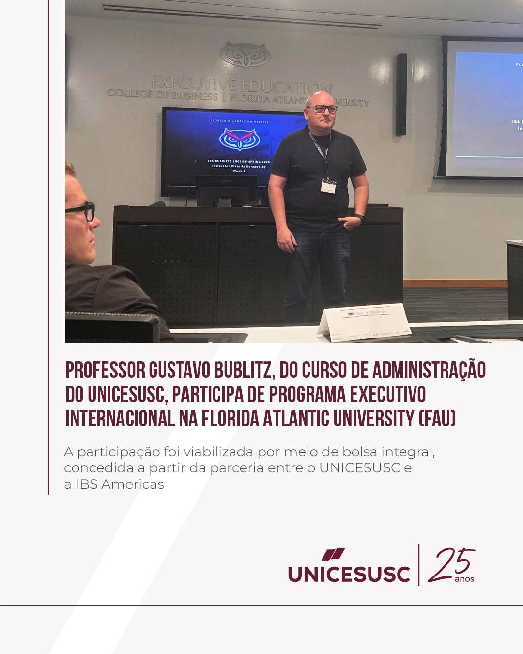 A constante atualização do corpo docente de excelência no UNICESUSC é um dos pilares que sustentam a qualidade do ensino oferecido pela instituição. Esse compromisso se materializa na participação do professor Gustavo Bublitz, docente do curso de Administração, em um Programa Executivo Internacional realizado na Florida Atlantic University (FAU), em Boca Raton, nos Estados Unidos.