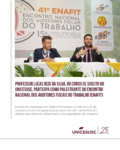O professor Lucas Reis da Silva, do curso de Direito do UNICESUSC, participou como palestrante do Encontro Nacional dos Auditores Fiscais do Trabalho (Enafit), realizado entre os dias 26 e 31 de outubro, em Belém (PA).
