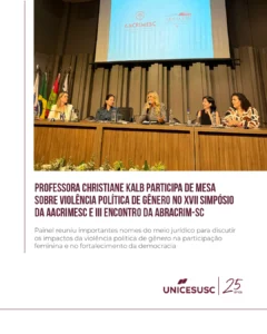 A coordenadora do curso de Direito do UNICESUSC, professora Christiane Kalb, esteve presente na mesa “Violência Política de Gênero – Desafios à Democracia e aos Direitos Fundamentais das Mulheres no cenário Jurídico Brasileiro”, realizada durante o XVII Simpósio da AACRIMESC e o III Encontro da ABRACRIM-SC, no auditório da OAB/SC, na última sexta-feira, dia 26 de setembro.