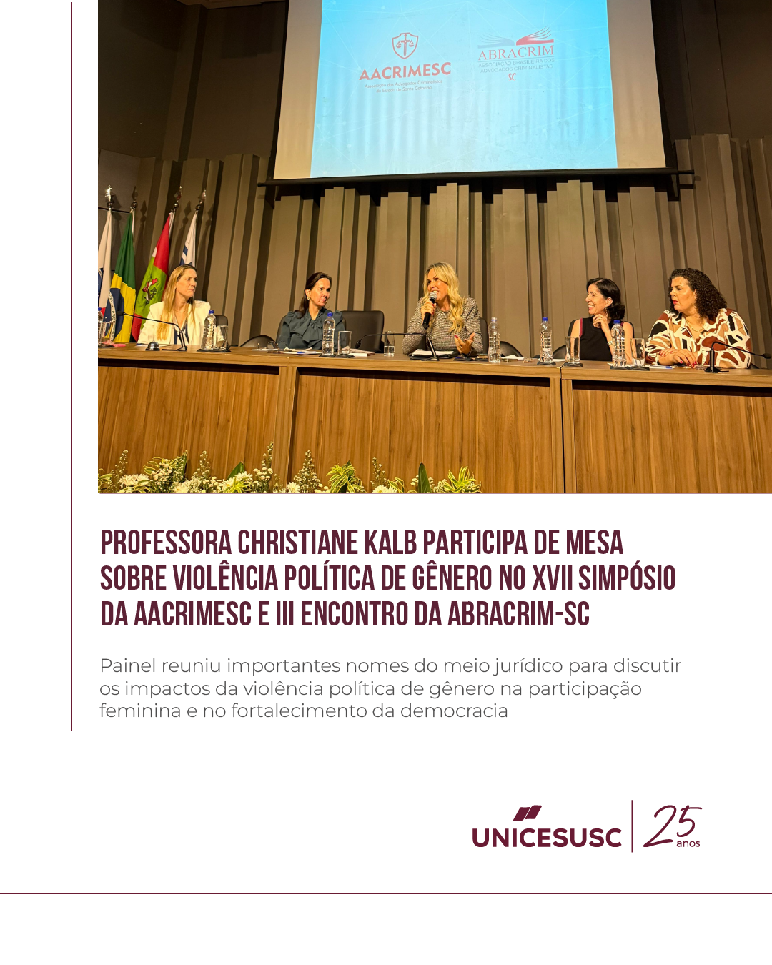 A mesa foi presidida pela Dra. Débora Farah, ex-juíza substituta do TRE, e contou ainda com a participação da Dra. Renata Albuquerque, presidente da Comissão da ABRACRIM Mulher em Santa Catarina. Também marcou presença a presidente da AACRIMESC, Dra. Elisangela Muniz, que compartilhou sua trajetória e os desafios enfrentados durante sua gestão à frente da associação.