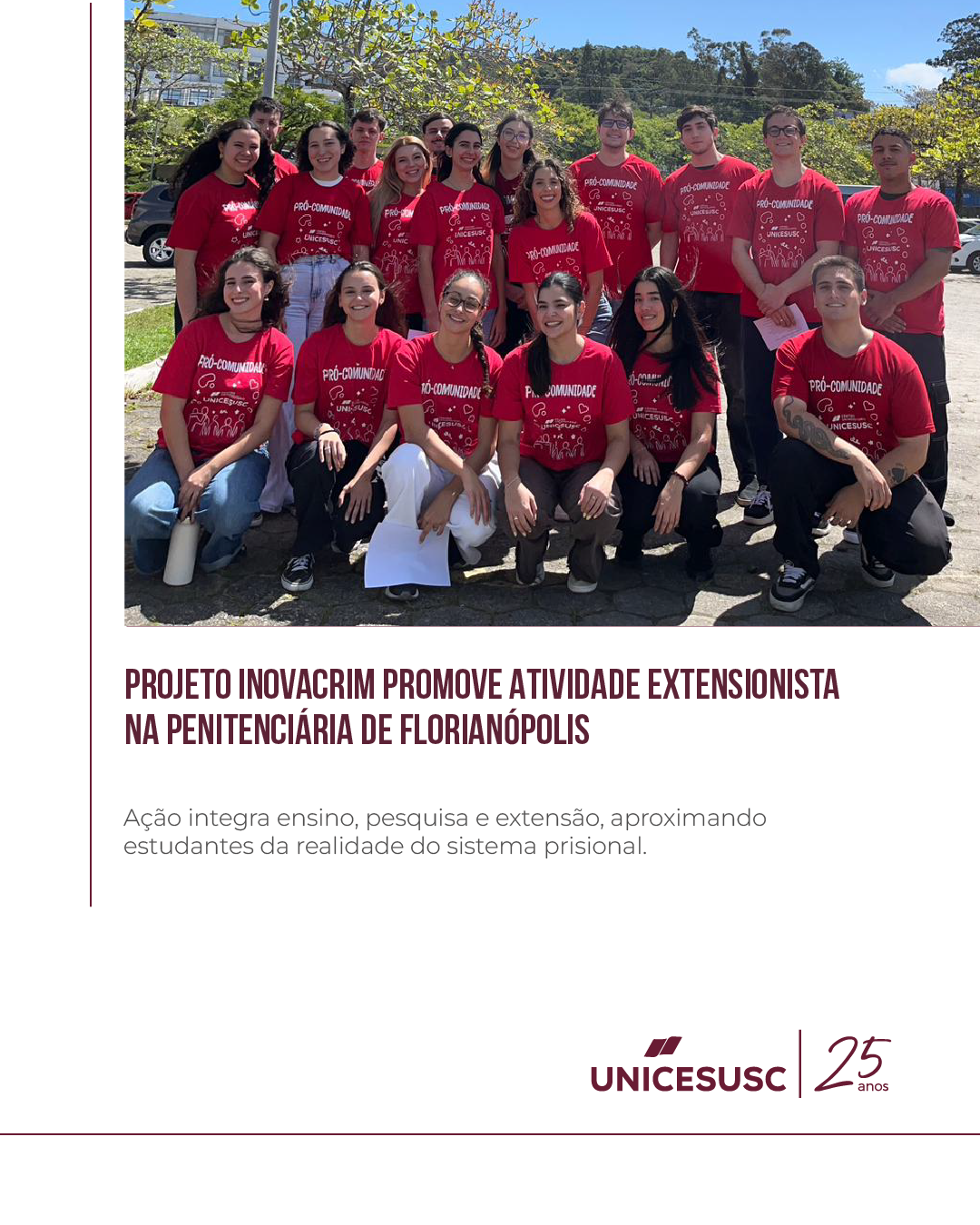 Estudantes do Projeto de Extensão Inovacrim do Direito, sob coordenação da Profa. Ma. Iara Lopes, estiveram na Penitenciária de Florianópolis participando de uma roda de conversa com detentos da unidade.