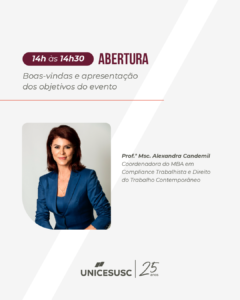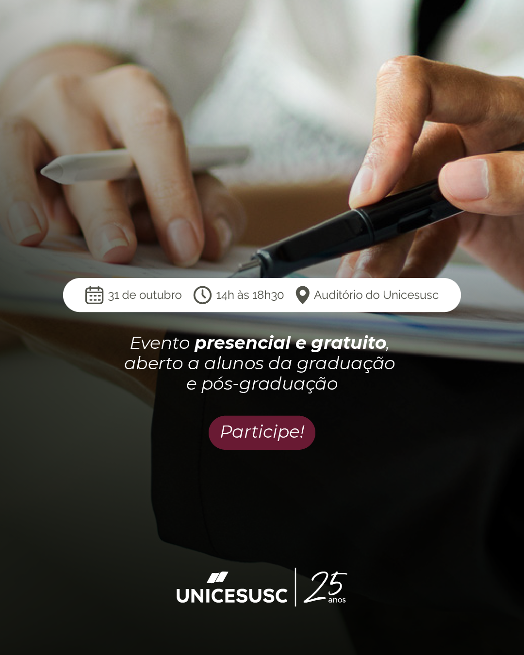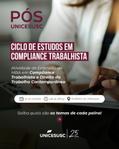O UNICESUSC promove, no dia 31 de outubro, o Ciclo de Estudos em Compliance Trabalhista, uma atividade de extensão gratuita e presencial vinculada ao MBA em Compliance Trabalhista e Direito do Trabalho Contemporâneo. O evento tem como objetivo fomentar o debate sobre temas fundamentais para o fortalecimento da ética, da integridade e da responsabilidade nas relações de trabalho.