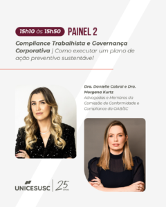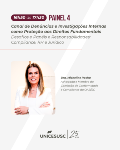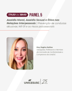 A programação conta com cinco painéis temáticos, que abordarão desde a criação de uma cultura de integridade até o papel do gestor na responsabilidade corporativa e na prevenção de condutas abusivas. Será uma oportunidade enriquecedora para aprofundar conhecimentos, trocar experiências e ampliar a rede de contatos entre profissionais e estudantes das áreas de Direito, Recursos Humanos e Compliance.