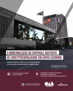 O UNICESUSC estará presente no Seminário “A Modernização do Controle Abstrato de Constitucionalidade em Santa Catarina”, que será realizado no dia 5 de novembro, a partir das 13h, no Auditório Antonieta de Barros, na Assembleia Legislativa do Estado de Santa Catarina (ALESC).
