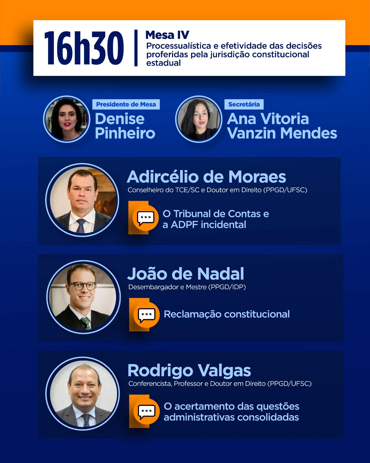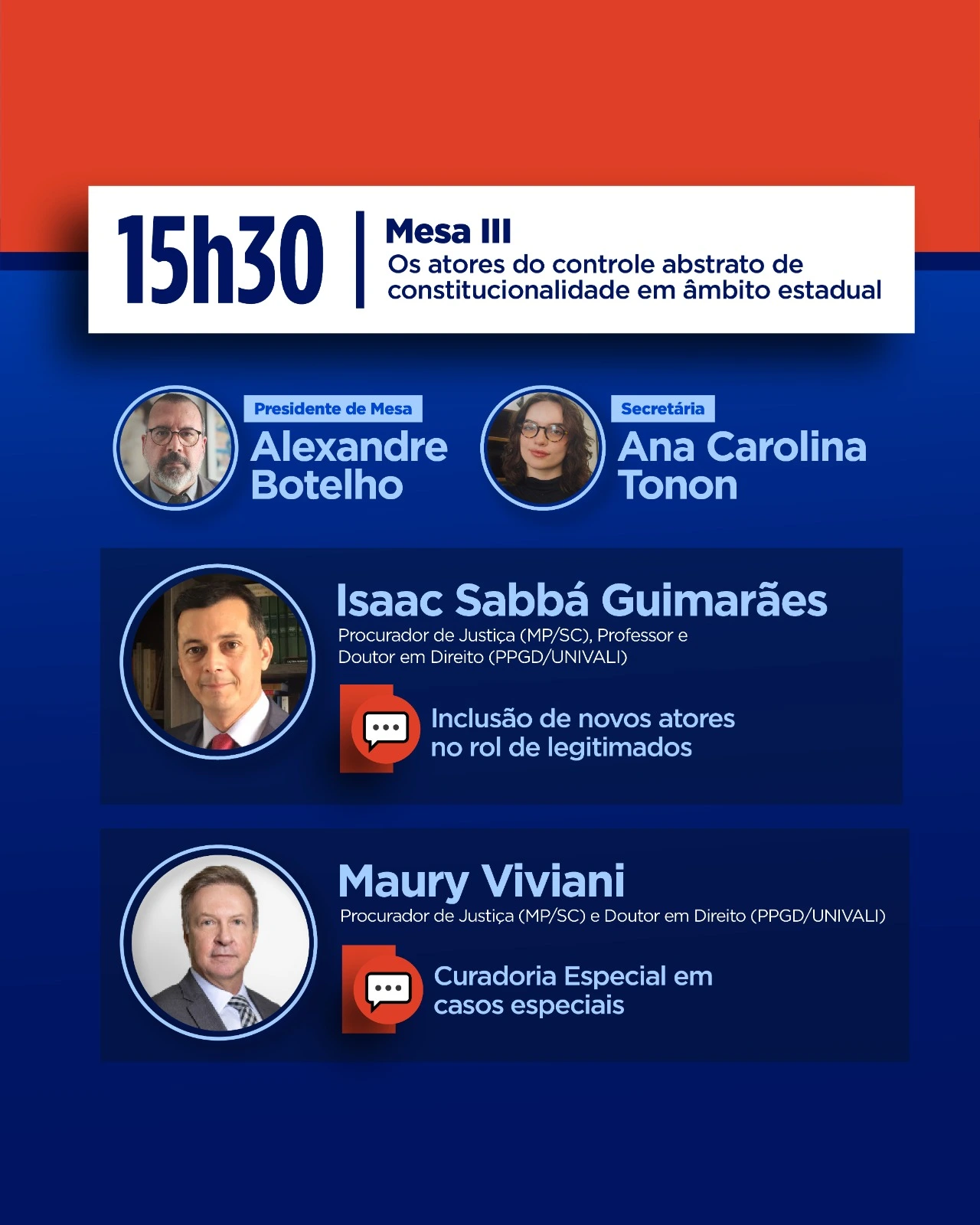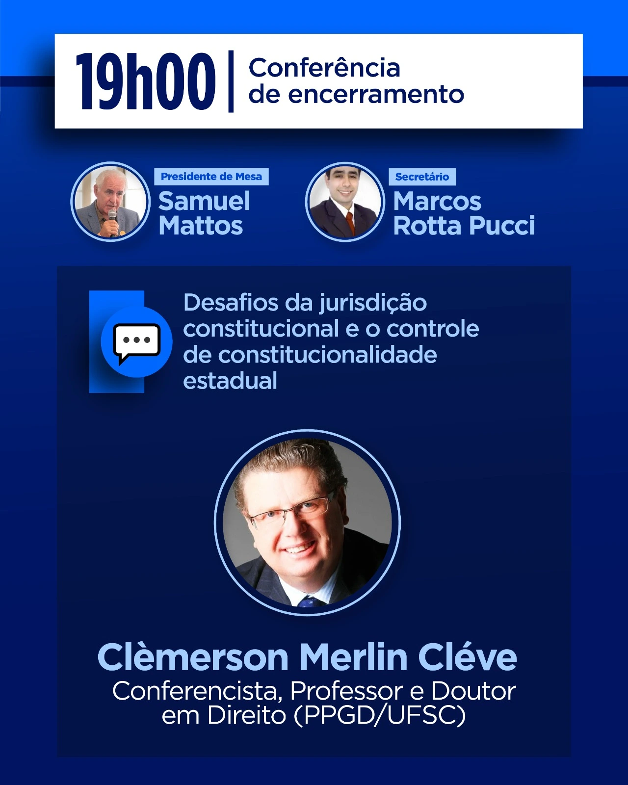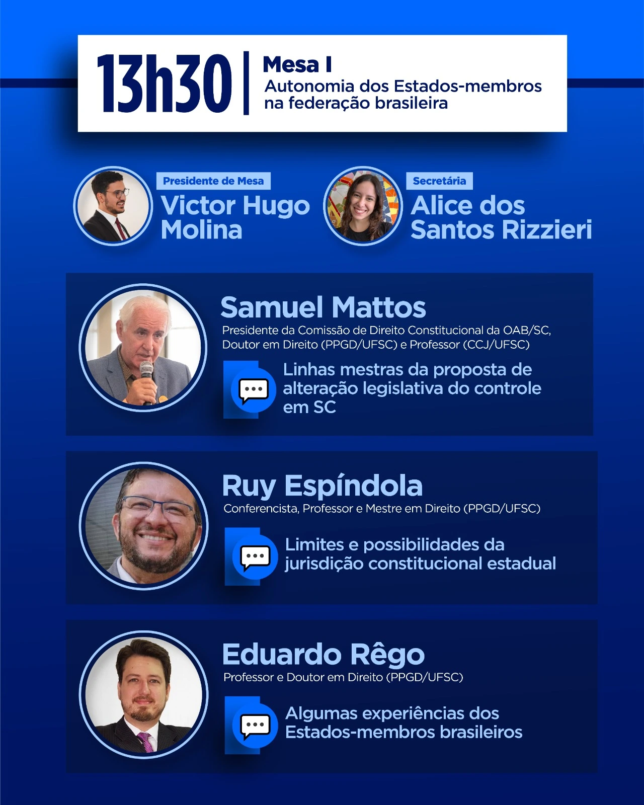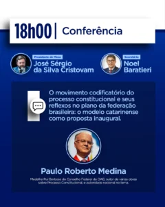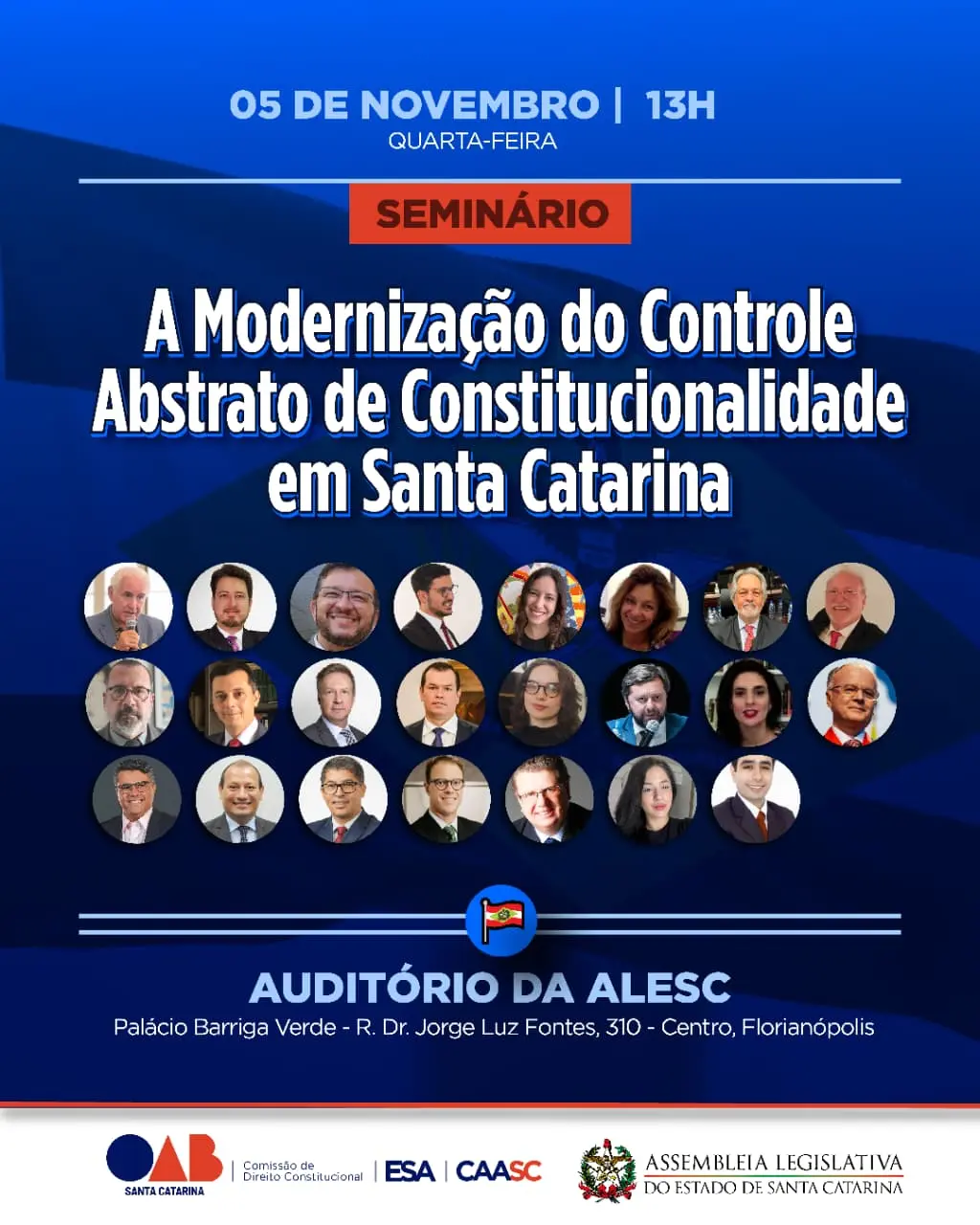 O evento, promovido pela OAB/SC, por meio de sua Comissão de Direito Constitucional, em parceria com a ALESC, reunirá as mais altas autoridades do Estado — entre elas, o Governador, o Presidente da ALESC, o Presidente do TJSC, o Presidente do MPSC, o Presidente do TCESC e o Presidente da OAB/SC — compondo a Mesa de Abertura, ao lado de representantes do meio acadêmico.