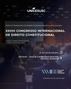 Neste sentido, o UNICESUSC apoia e divulga o XXVIII Congresso Internacional de Direito Constitucional que será realizado pelo IDP em Brasília, entre os dias 21, 22 e 23 de outubro de 2025.