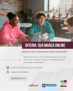 A Oficina “Sua Marca Online: Aprenda a Usar as Redes para Vender e Compartilhar”, acontecerá nos dias 02, 03 e 04 de dezembro, das 14h às 17h30, e se destina a abordar questões relacionadas com foco prático em vendas e visibilidade comercial para aumentar o interesse e a aplicabilidade imediata do conhecimento.