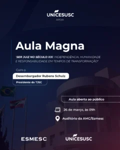 O UNICESUSC, em parceria com a Escola Superior da Magistratura do Estado de Santa Catarina (ESMESC), tem a satisfação de apoiar a Aula Magna do Curso de Preparação à Magistratura, que marca o início das atividades acadêmicas de 2026.