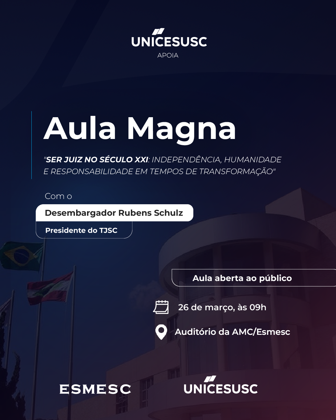 O UNICESUSC, em parceria com a Escola Superior da Magistratura do Estado de Santa Catarina (ESMESC), tem a satisfação de apoiar a Aula Magna do Curso de Preparação à Magistratura, que marca o início das atividades acadêmicas de 2026.