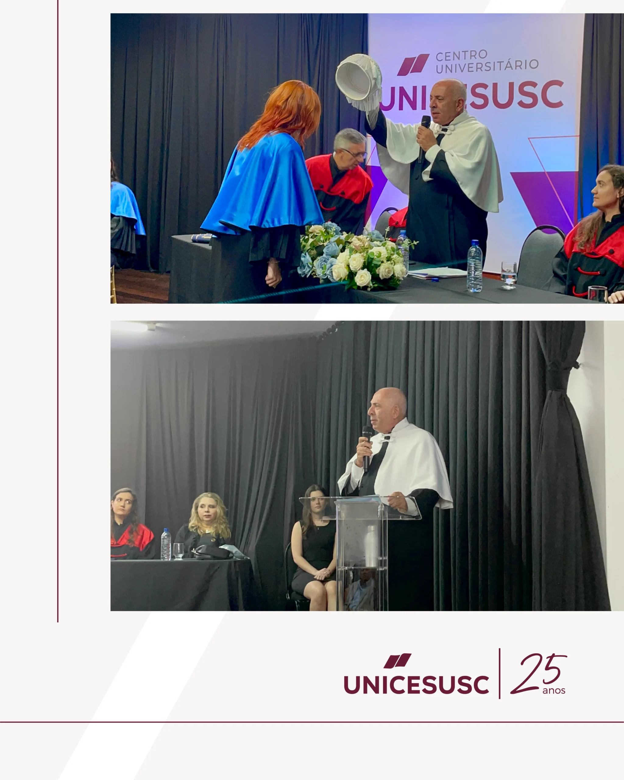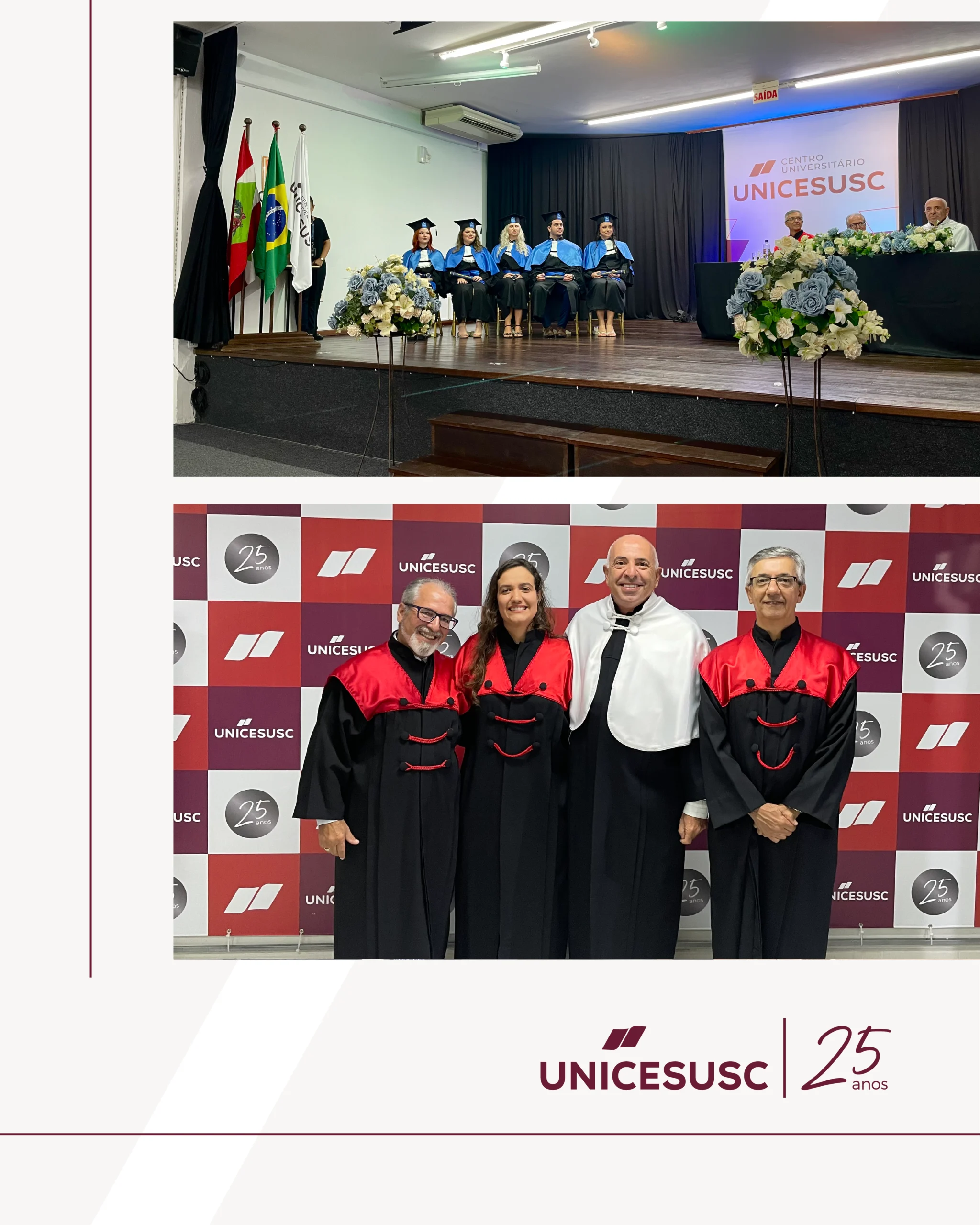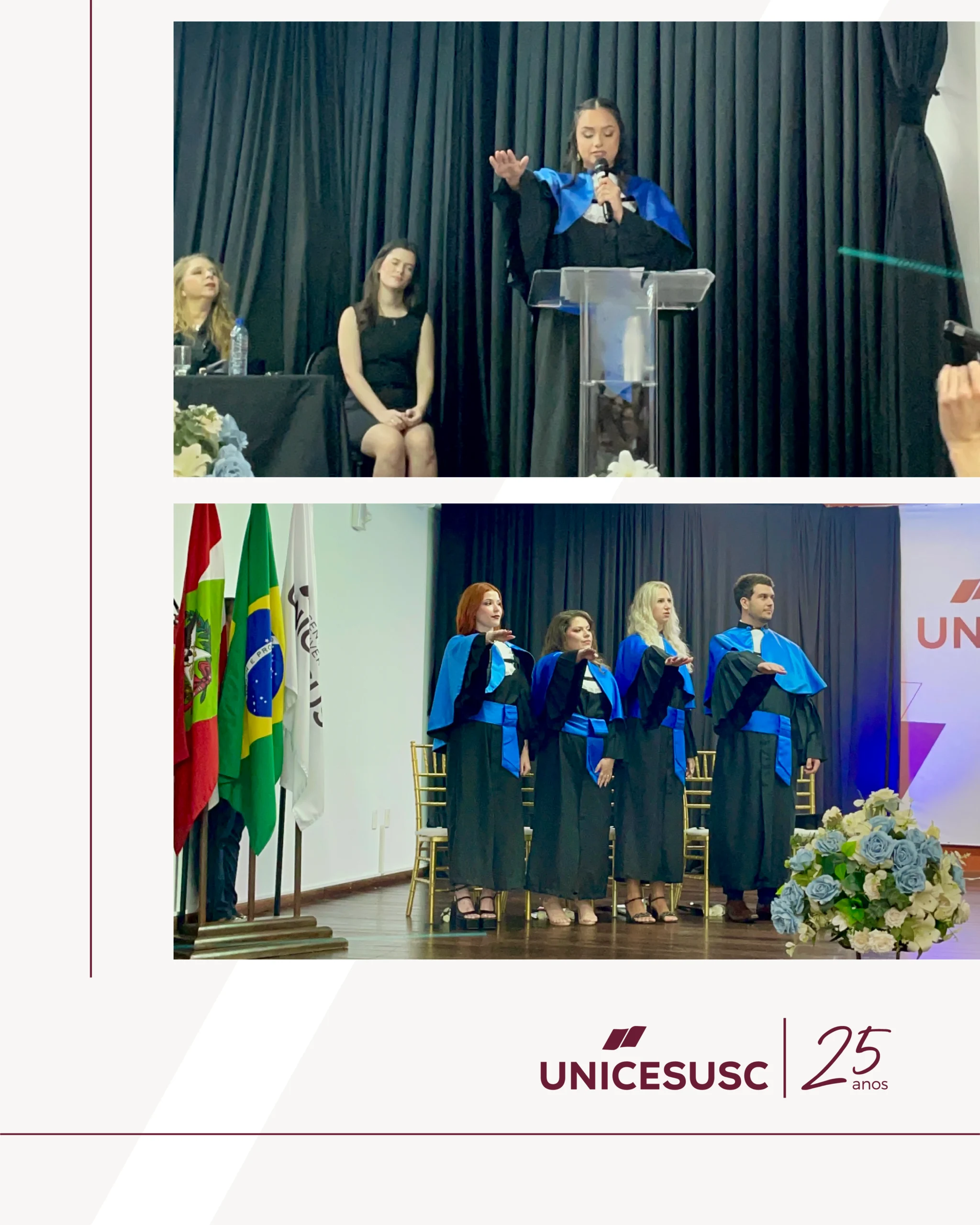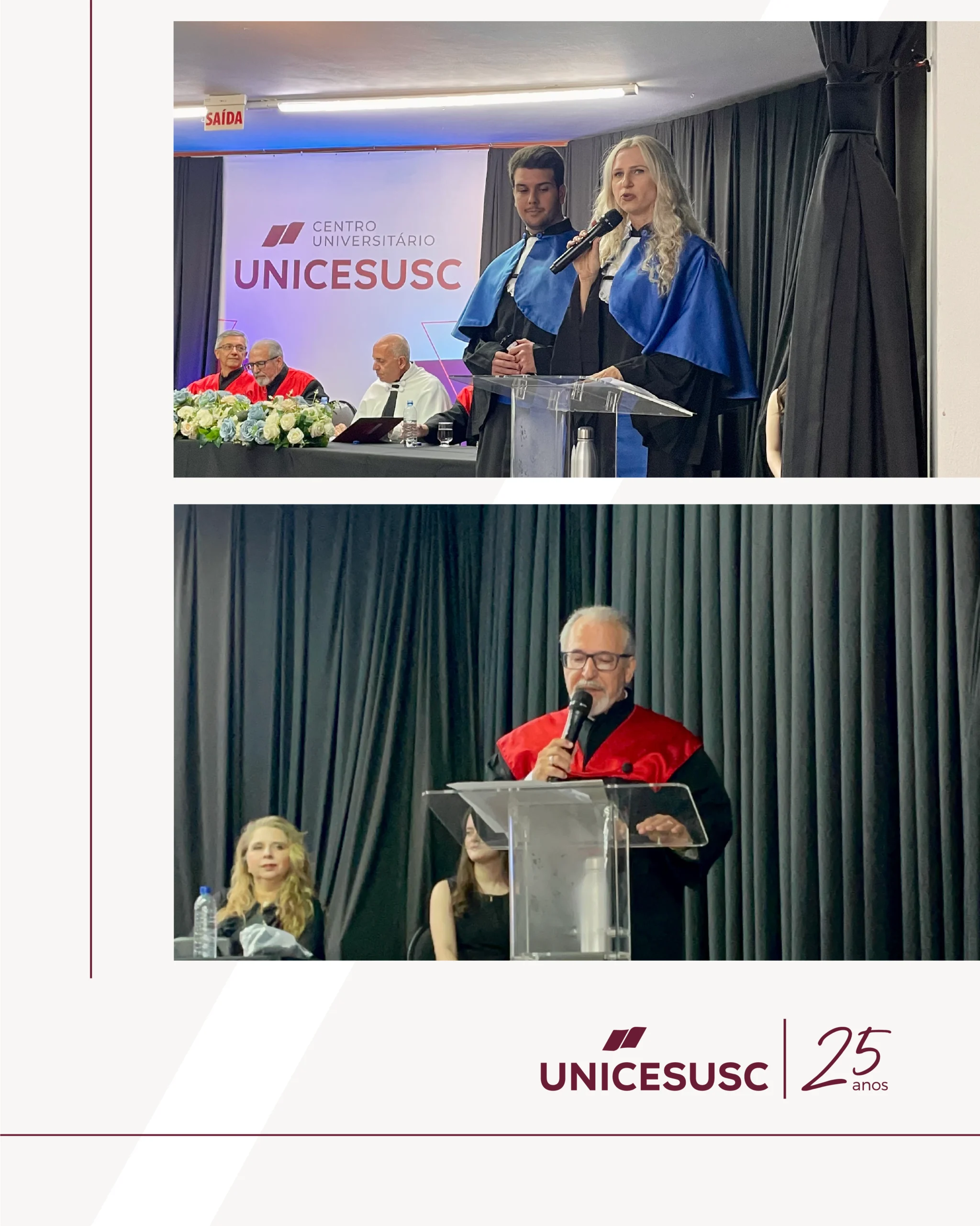 A solenidade de Outorga de Grau foi conduzida pelo Reitor do UNICESUSC, professor Mauricio Pereira Gomes. Como forma de reconhecimento, a turma escolheu o professor Carlos Fernando Machado Pinto como Paraninfo e a professora Renata Mansuelo Alves Domingos como Patrona. Também foram homenageados os professores Cristiana Terezinha Silva Trichez, Patricia Sarquis Herden, Pery Segala e Ronaldo Martins, que fizeram parte dessa trajetória.