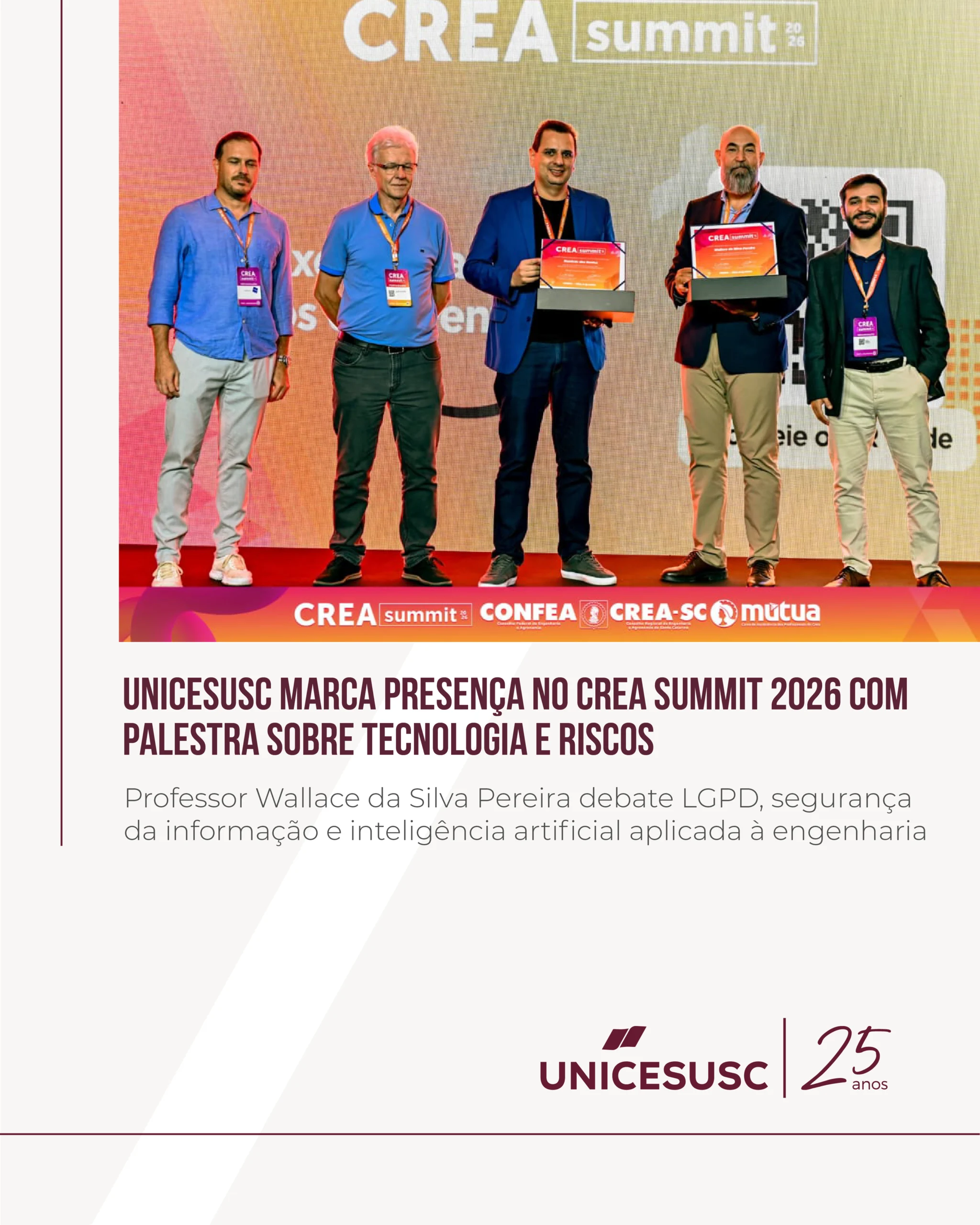A participação no CREA Summit 2026 reforça o compromisso do UNICESUSC com a formação conectada às demandas do mercado e com os debates que impactam diretamente o futuro das profissões.