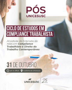 No dia 31 de outubro, o UNICESUSC realiza o Ciclo de Estudos em Compliance Trabalhista, um evento que reúne especialistas para discutir temas fundamentais como integridade, cultura organizacional, ESG e ética nas relações de trabalho.